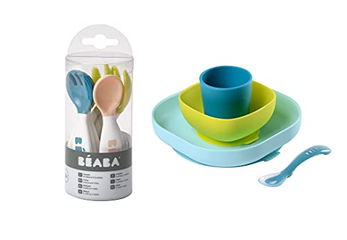 BEABA Toddler Self Feeding Cutlery and Silicone 4-Piece Meal Set - Soft, Unbreakable, Non-Slip Suction Bottom