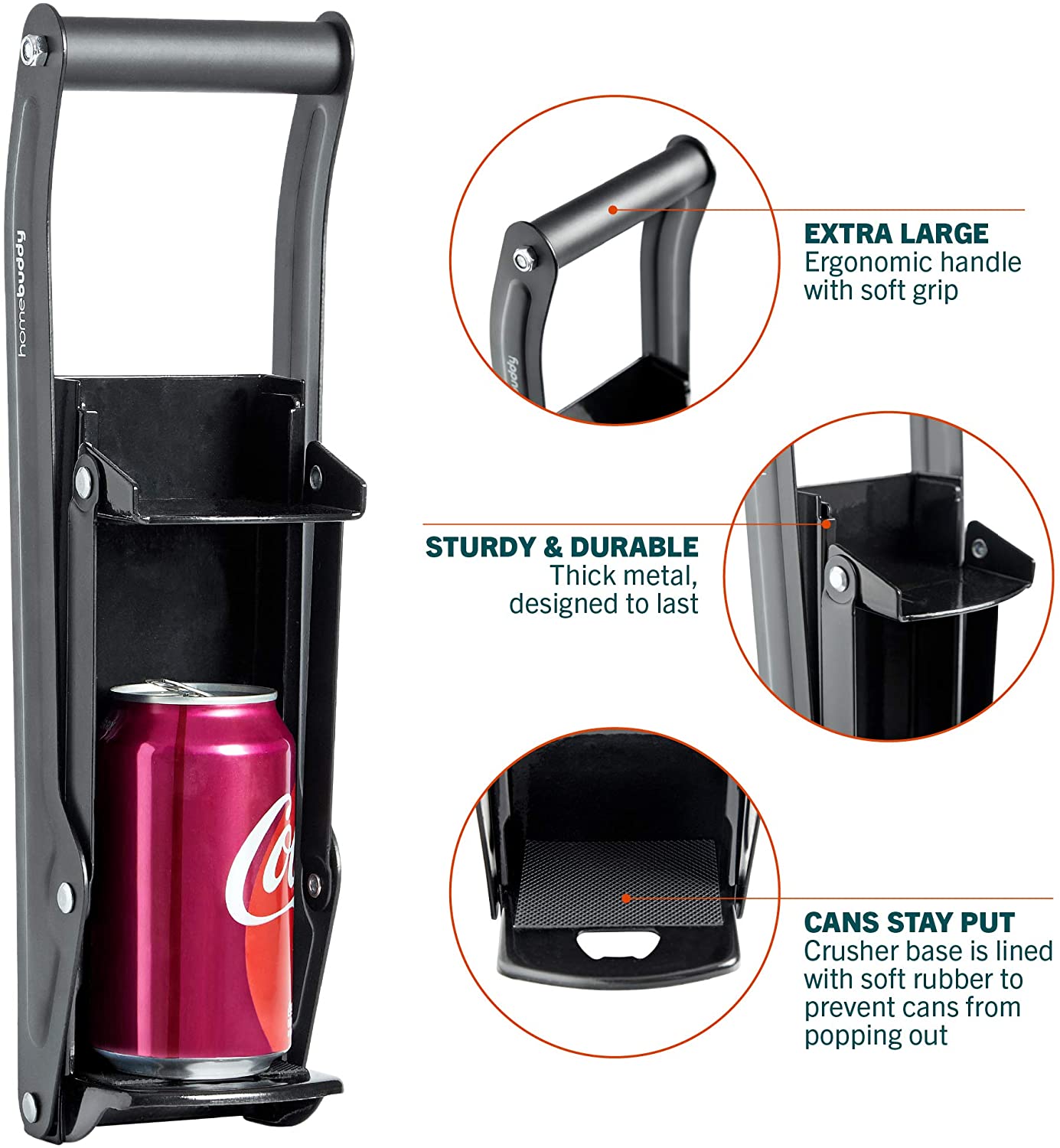 - 👌 NO POPPING OUT - A rubber-lined metal can crusher's base prevents cans from popping out, and a longer, wider handle doesn’t bend or tire your arm. With this soda can smasher, easily crush cans in bulk!
